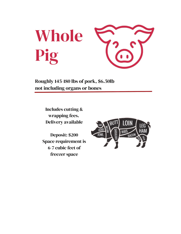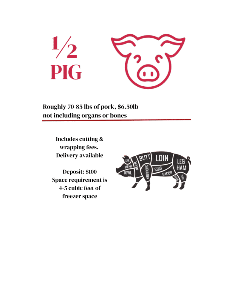 Please note: All weights and prices are approximate. The final weight and cost will be determined after the animal is harvested. The actual amount of meat you take home will vary depending on the cuts you select.