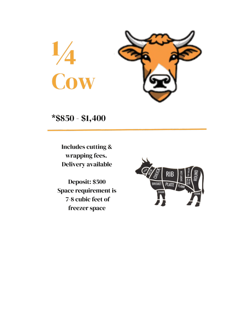 Price Range: $950 - $1,250 Quarter Beef Share *Price is determined by Hanging Rail Weight.