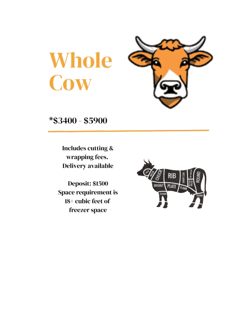 Price Range: $4,400 - $5,000 Whole Beef Share *Price is determined by Hanging Rail Weight.